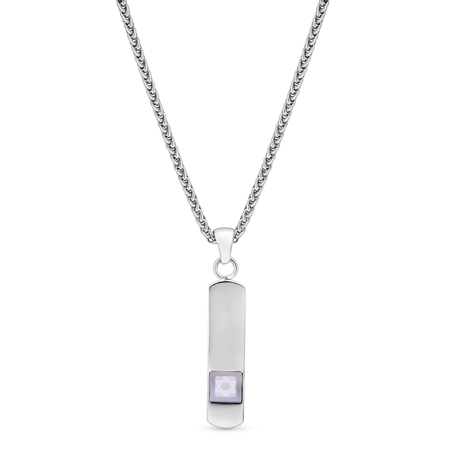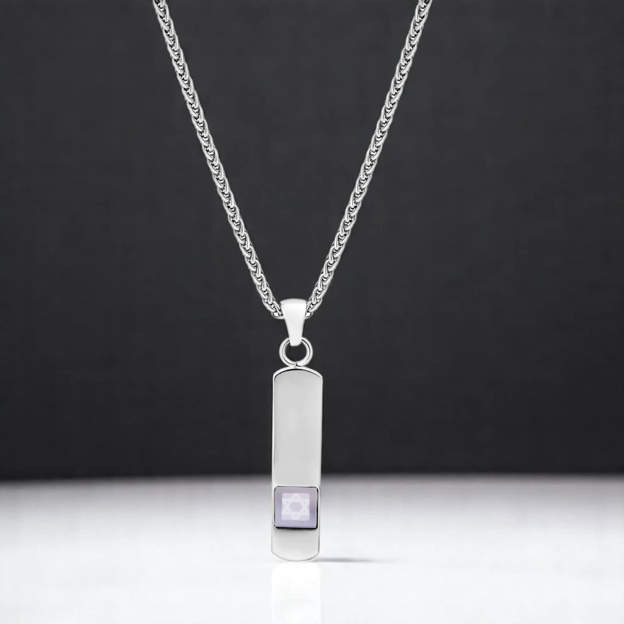 בלב התליון שוכן שבב זכוכית בגודל של 6.2 מ"מ בלבד, עליו נחרטו כתבי הקודש במלואם. השבב מוקף במסגרת מתכתית חלקה ומבריקה, המבליטה את סמל מגן הדוד בתוכו – סמל הנצח של העם היהודי, אשר מקבל כאן פרשנות חדשנית ומרגשת.