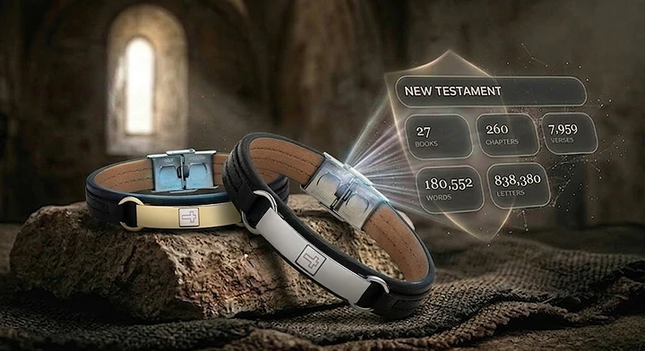 No centro deste poderoso bracelete, está integrado um chip de vidro miniaturizado contendo toda a Bíblia Hebraica, gravada com tecnologia nano inovadora. A união entre o couro premium, o aço inoxidável e a tecnologia avançada cria uma joia que combina força material com majestade espiritual. Todas as 304.805 palavras sagradas são gravadas com tecnologia revolucionária neste minúsculo chip, criando uma conexão única entre o poder da matéria e a glória do espírito.