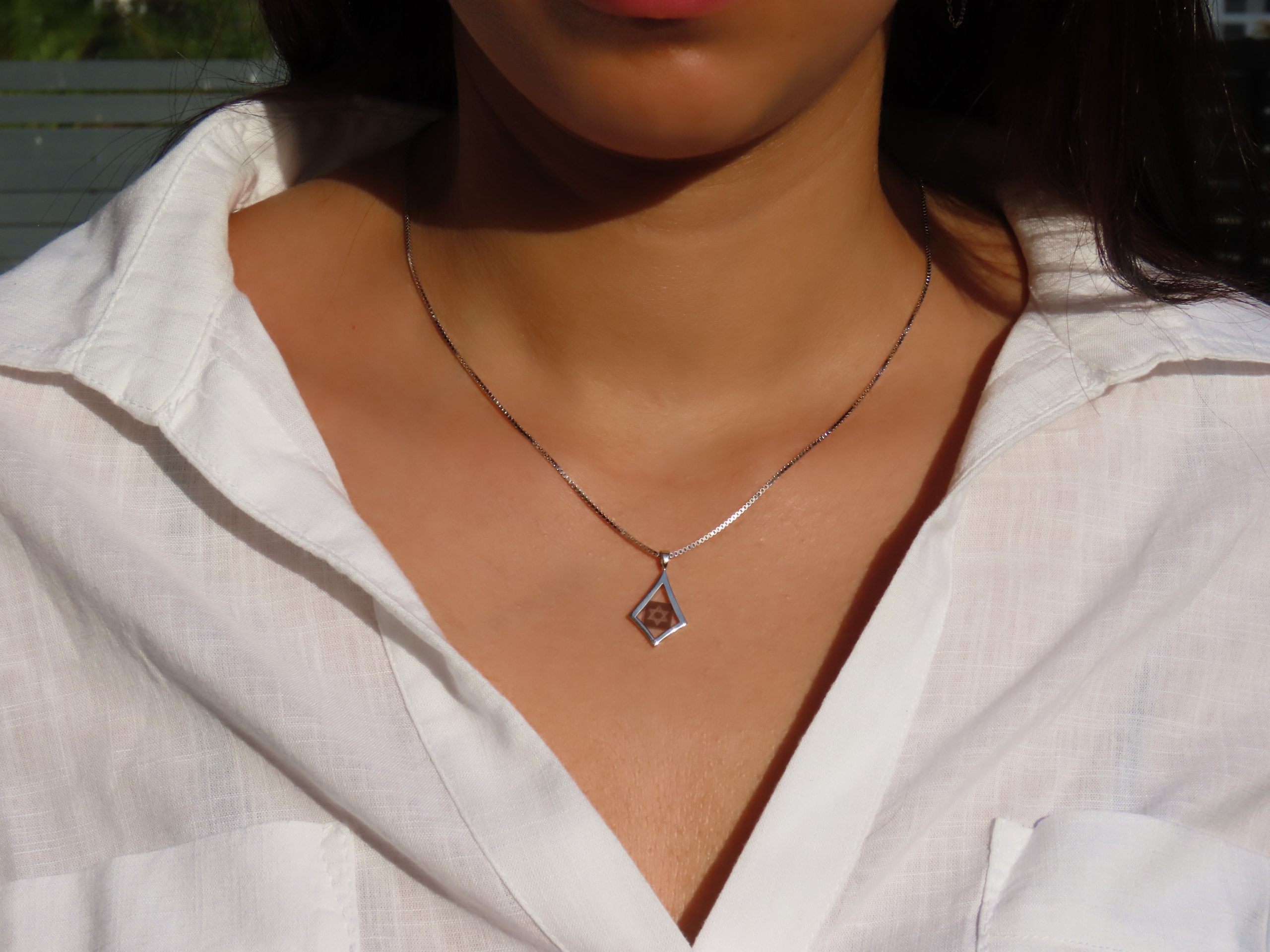 O colar e o pingente são feitos de prata de lei 925 com banho de ródio.