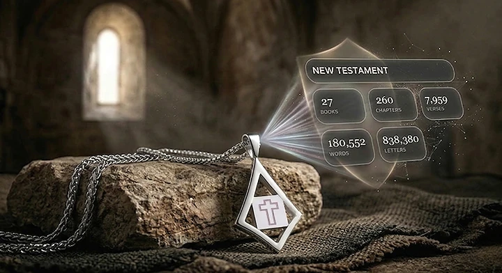 No coração do colar está integrado um minúsculo chip de vidro contendo toda a Bíblia Sagrada, gravada através de avançada tecnologia nano, permitindo que você carregue consigo as escrituras sagradas de uma forma nunca antes vista. Todas as 304.805 palavras da Bíblia são delicadamente gravadas no chip miniaturizado, como orvalho que cai suavemente, demonstrando como ciência e arte podem colaborar para criar uma peça que contém poder espiritual e santidade junto com design moderno e elegante.